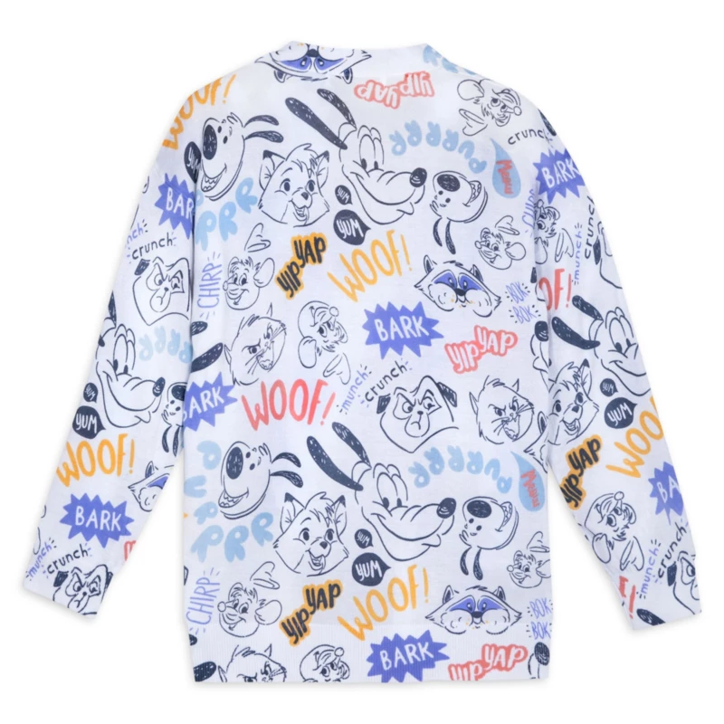 Layer up your look with some furry friends on this knit cardigan featuring a cast of Disney critters all over the fabric.