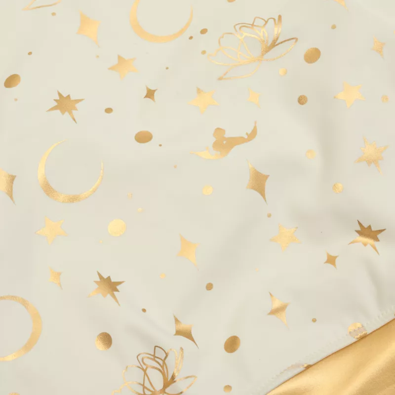 Rule the palace or wherever you work out. Or just work it in this gorgeous Jasmine active wear top. The allover metallic golden pattern features Jasmine flying a magic carpet in silhouette amid a flurry of pretty icons inspired by Disney’s Aladdin. All this and the shimmery golden wrap detail and flattering sports crop top fit prove active wear can be as fierce as the person wearing it.
