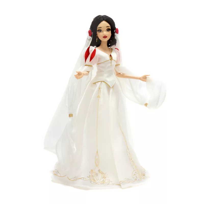 ”Magic mirror on the wall, who is the fairest one of all?” In honor of the 85th Anniversary of Snow White and the Seven Dwarfs, this collectible doll imagines the enchanting bride as her happily-ever-after dreams come true. A classic beauty with ”lips red as the rose, hair black as ebony, skin white as snow,” celebrate Walt Disney’s original Princess with this storybook wedding keepsake.