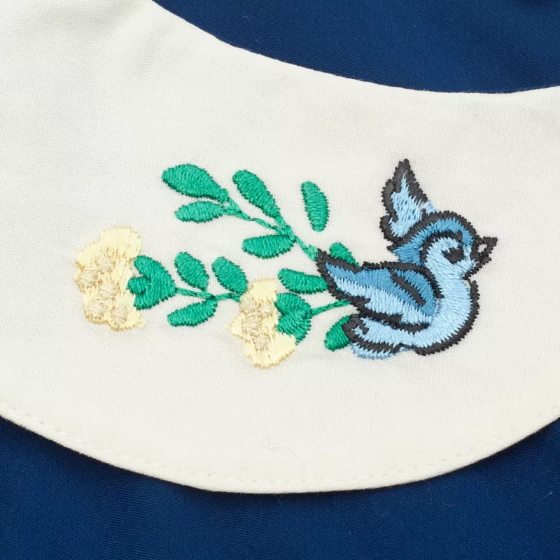- Contrasting Peter Pan collar with embroidered apple, bird and flowers