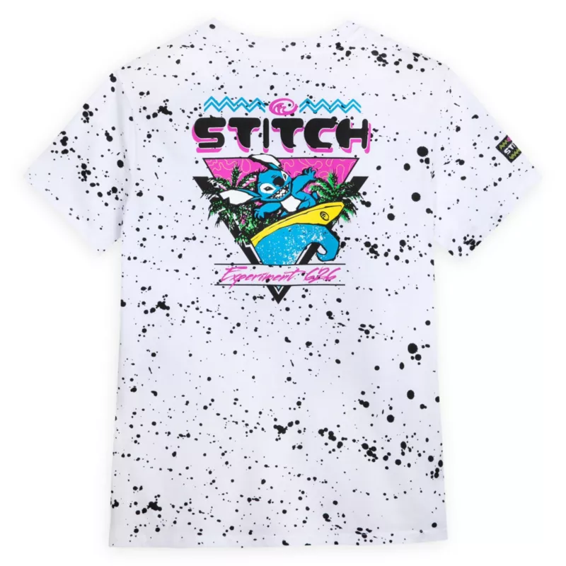 Hang ten with Stitch in this retro 1980s surfer style t-shirt featuring an all over splatter effect. Ride the “Hawaiian Rollercoaster” alongside our mischief-making mascot.